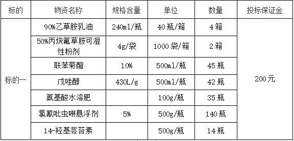 3.原則上由投標(biāo)單位按貨物需求進(jìn)行投標(biāo),若規(guī)格不符,投標(biāo)單位也可以根據(jù)自有包裝規(guī)格進(jìn)行投標(biāo)。本次招標(biāo)采購(gòu),確定生產(chǎn)廠(chǎng)家或代理商、農(nóng)藥品種、規(guī)格、劑型和農(nóng)藥單價(jià)。
