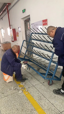 維修臺(tái)車時(shí),我當(dāng)起了孫師傅的下手,一邊將臺(tái)車穩(wěn)住不能傾倒,一邊看著孫師傅卸下每個(gè)車輪子并進(jìn)行仔細(xì)清理不怕臟、不怕累,毫無(wú)怨言,一絲不茍,動(dòng)作利落,手法嫻熟,親身直面他的高效率和專業(yè)水平還對(duì)我詳細(xì)解說(shuō)讓我理解每個(gè)步驟的重要性和關(guān)鍵點(diǎn)。我們蔣姐也過(guò)來(lái)幫忙,不停的清掃臺(tái)車上清理出來(lái)的垃圾……
