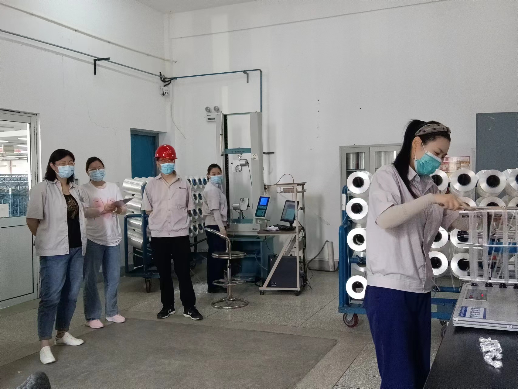 上午9:30,物檢班組緊接著開始比賽。纖度檢測首先上場的是王玉梅同志,掛絲、繞絲、打結、稱重有條不紊的完成了比賽。強度檢測比賽中侯義芹同志第一個出場,以幾乎完美的表現(xiàn)完成了比賽。經(jīng)過激烈的角逐,王娟同志以4分10秒05獲得了纖度檢測第一名,侯義芹同志1分51秒14獲得強度檢測第一名 。