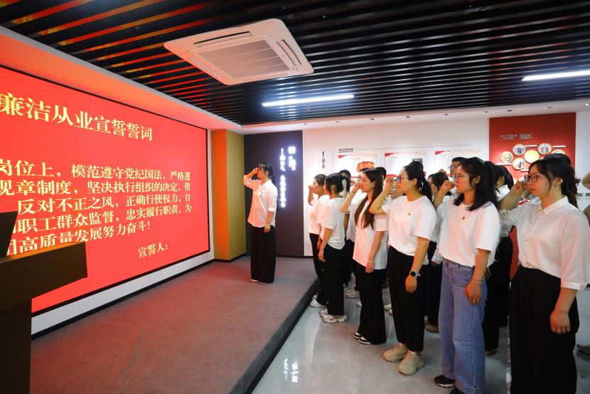 在臺(tái)北(華茂)公司環(huán)保裝備產(chǎn)業(yè)園,參加活動(dòng)人員先后參觀了臺(tái)北黨員自繪的廉潔漫畫作品、廉潔教育室。隨后,青年黨員代表進(jìn)行了廉潔從業(yè)宣誓,集中觀看了近年來臺(tái)北(華茂)公司自拍自導(dǎo)自演的優(yōu)秀廉潔文化微視頻、微電影。
