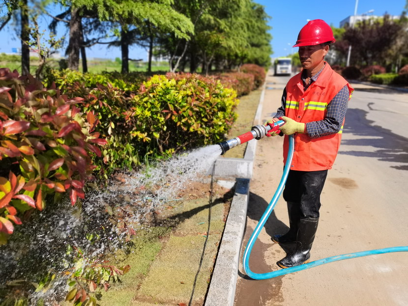 在各條基礎(chǔ)養(yǎng)護(hù)路段,綠化工人正在澆水,為花草樹木“解渴”。尤其是剛移植的苗木和剛出土的青苗,氣溫較高,容易造成脫水。通過適度澆水,保持土壤濕潤(rùn),促進(jìn)植物根系吸收土壤中的養(yǎng)分,有助于生長(zhǎng)和扎根,提高綠化成活率。