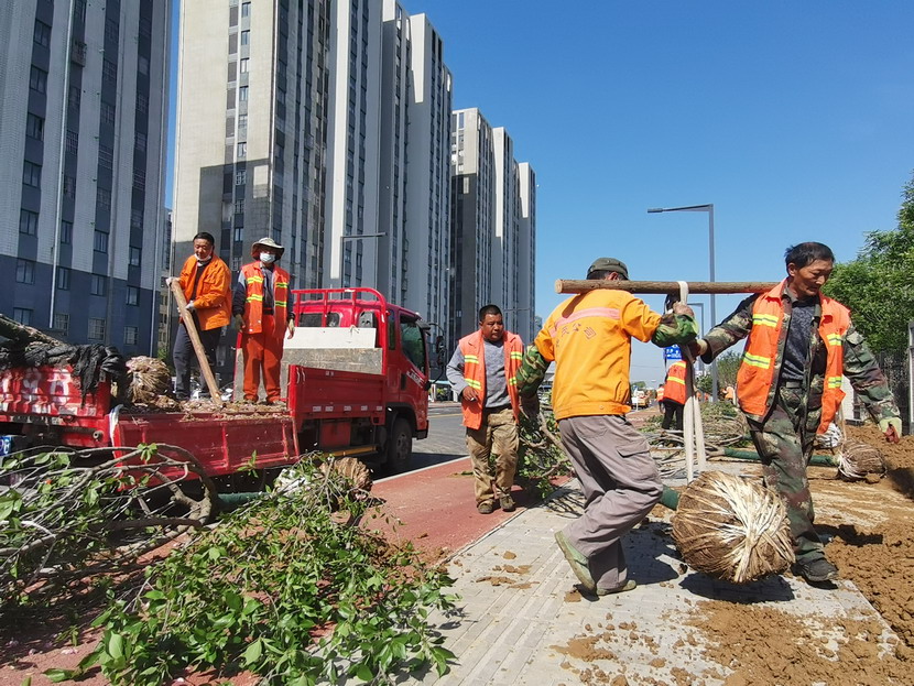 在中科院,只見工程車輛來來往往、橙色身影忙忙碌碌……到處都是一派繁忙、紅紅火火的景象。闖將孫玉虎,虎將金華穿梭在工程現(xiàn)場(chǎng),親自指揮調(diào)度綠化工程收尾工作。大家分工有序:定點(diǎn)劃線、搬運(yùn)苗木、栽植澆水、垃圾清理……有條不紊。中午時(shí)分,熾熱的陽光照在臉上也是火辣辣的,忙碌了一上午的工人大汗淋漓,擰開瓶蓋,咕嚕咕嚕喝了幾大口涼水,用袖子蹭了下額頭的汗,又干勁十足地投入到工作中。