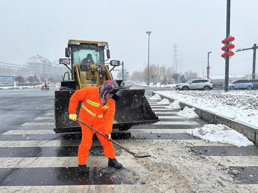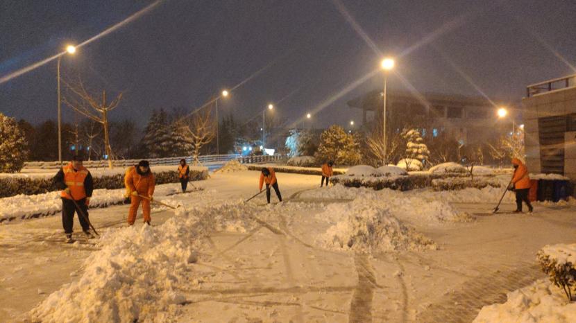 上午10時(shí)許,暴雪如約而至。裝有融雪劑的車輛全部整裝待發(fā),聞令而動(dòng),采取“人工+機(jī)械”不間斷作業(yè)模式,對(duì)轄區(qū)主次干道、橋涵、火車站東站、創(chuàng)智大廈等帶坡路段及時(shí)拋撒融雪劑,采取“滾刷+鏟車”組合方式,反復(fù)排掃路面積雪,確保主次干道、帶坡路段通暢無冰。