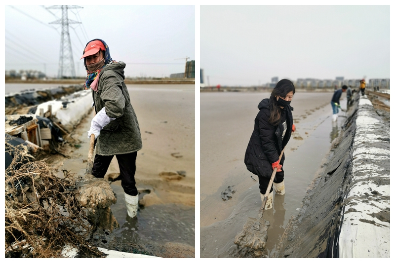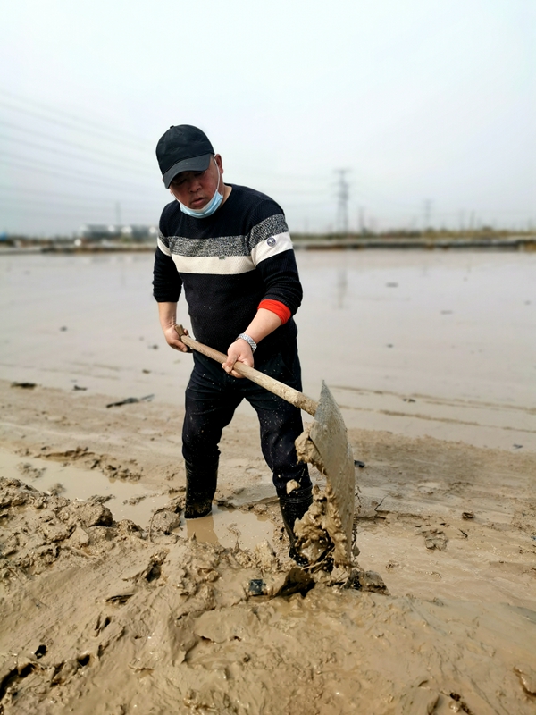 往東邊看,先鋒東灘黨旗招展分外鮮紅,海州灣公司18個單元職工、3名班組長全員出動馳援大浦工區(qū)協(xié)同重整410閑置鈣鹽灘地。引水入溝、翻泥上堰、腳踩和整、鐵掀蹋平,動作嫻熟。1200余米的10條池堰僅用一天的就順利完工。