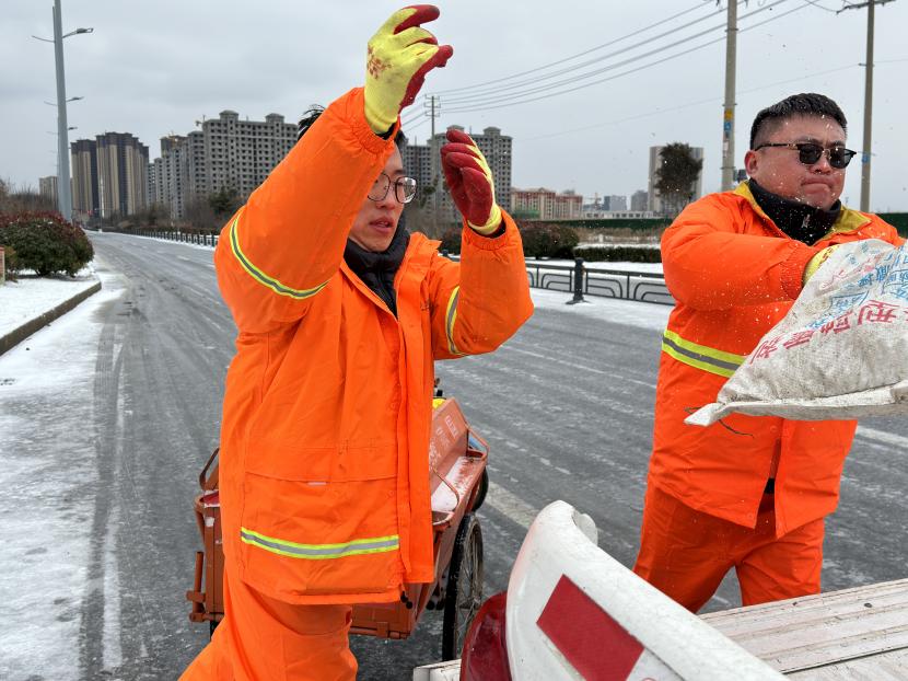 本次掃雪除冰共配備了3輛清掃車、2輛鏟車、1輛撒布機以及20余噸融雪劑,20余把推雪鏟、鐵鍬等清雪工具,采取“邊下邊除、邊除邊清、邊清邊運”的方式,根據(jù)道路積雪厚度和結冰情況,通過撒布融雪劑、除雪鏟推雪、人工配合等多措并舉,有效清理區(qū)內主干道積雪,做到“即下即掃、雪停路清”,保障群眾出行安全。此外,針對紅綠燈路口、馬路轉彎處、陡坡、橋面以及非機動車道等重要節(jié)點,環(huán)衛(wèi)分公司又出動了100余名工作人員點對點人工撒布融雪劑,共保障面積300余萬平方米。