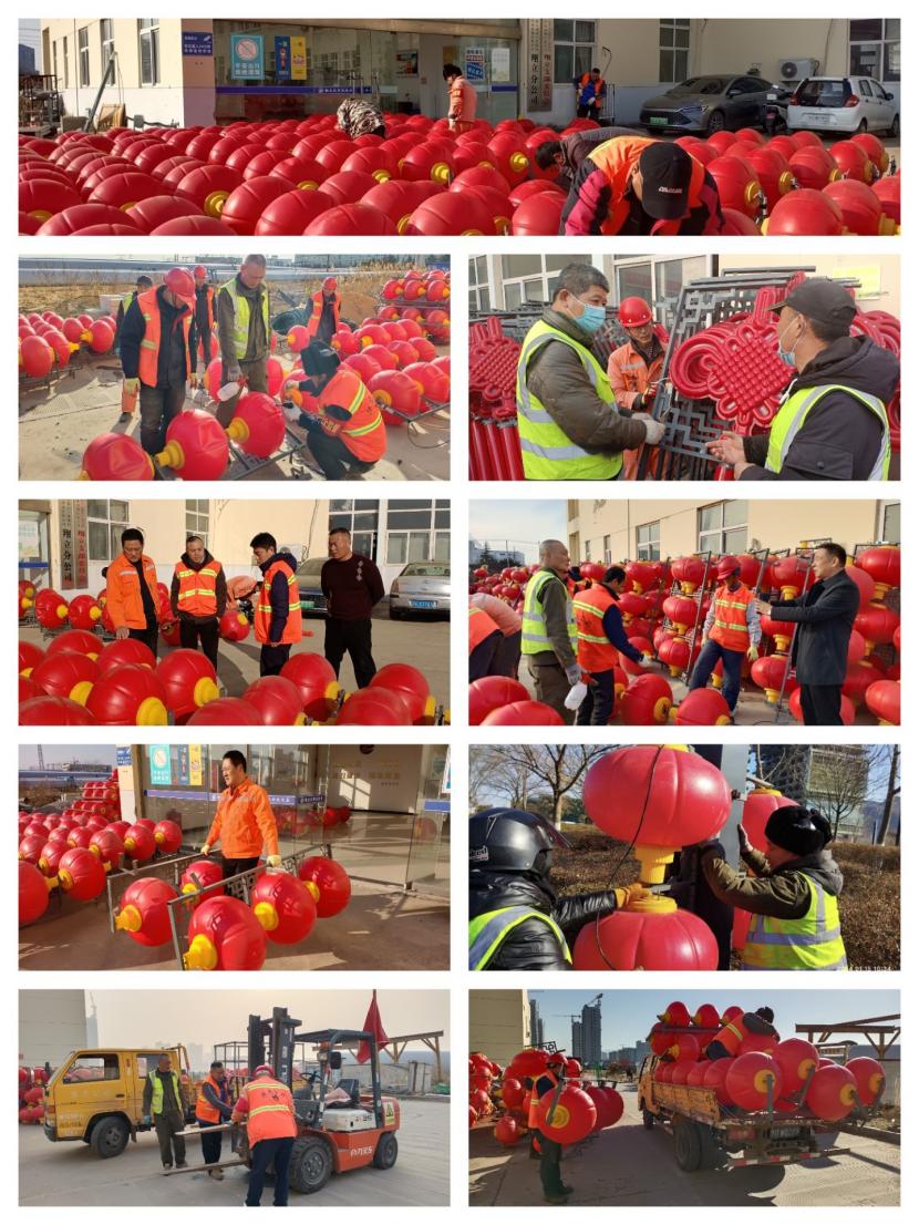 突出一個“聚”字,與以往不同的是,這次燈籠安裝工作也得到了兄弟單位的大力支持,益豐、盛達、資源、悅升公司在自身也有工程人手緊張的情況下先后派遣了12人次的電工、安全員、運輸車輛駕駛員等精兵強將支援本次燈籠懸掛精品工程突擊工作。人多力量大,白天安裝工程結(jié)束后,每天晚上公司組織專人對已安裝好燈籠的每條路段進行夜間巡查,對不亮的燈籠做好標記,白天進行修理,保障安裝的燈籠中國結(jié)百分之百的亮化率。