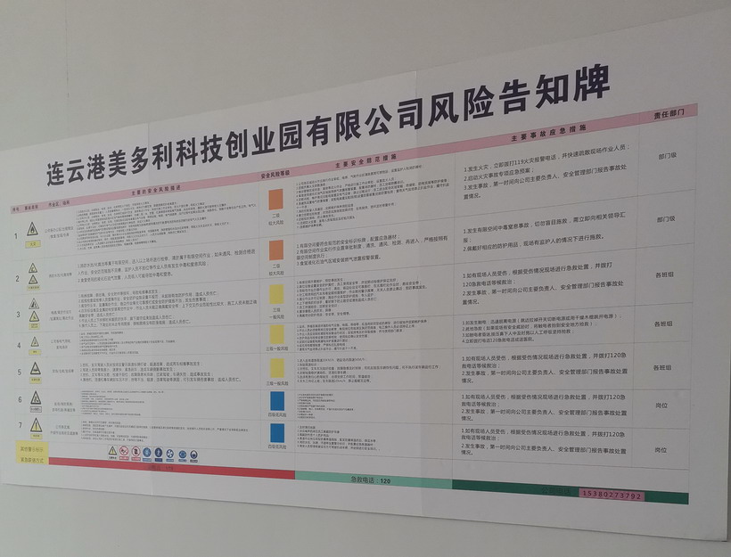 為進一步提升美多利公司安全管理水平,切實推行風險分級管控與隱患排查治理雙重預防機制試點工作。近日來,美多利公司組織全體員工開展雙重預防機制教育培訓。另外,對美多利公司消防泵房、特種設備等重點區(qū)域進行風險分級管控點檢,并對各個區(qū)域張貼崗位風險分級管控告知卡。