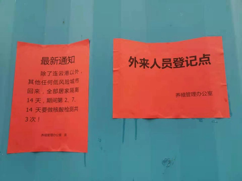 養(yǎng)殖管理辦公室迅速反應,成立防疫領導小組,加強值班值守,設置疫情防控設置隔離點、外來人員登記點,張貼疫情動態(tài)通知。養(yǎng)殖辦全員到“塘頭”排查是否有人員與中高風險地區(qū)回連人員的接觸史(包括家人和周邊鄰居)和疫苗接種情況;對來往車輛和人員進行逐一登記排查,宣傳防疫注意事項;并要求養(yǎng)殖戶不得雇傭除了連云港以外人員干活、不得讓除了連云港以外人員或車輛在池塘進出。