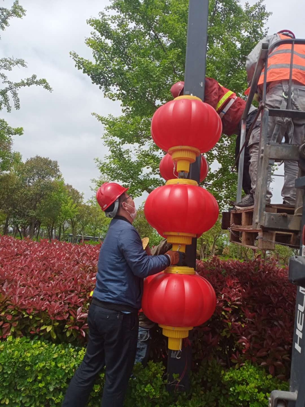 施工現(xiàn)場,大家配合默契利用小型叉車進行輔助拆除作業(yè),五分鐘不用一個燈籠就拆除完成。這邊完成拆除部分,那邊負責還原以及運送回收。由于燈籠的不可收攏性,同時為避免造成二次污染,對于拆下來的燈籠及時進行運送和回收保存,確保第二年要安裝的時候重復利用。