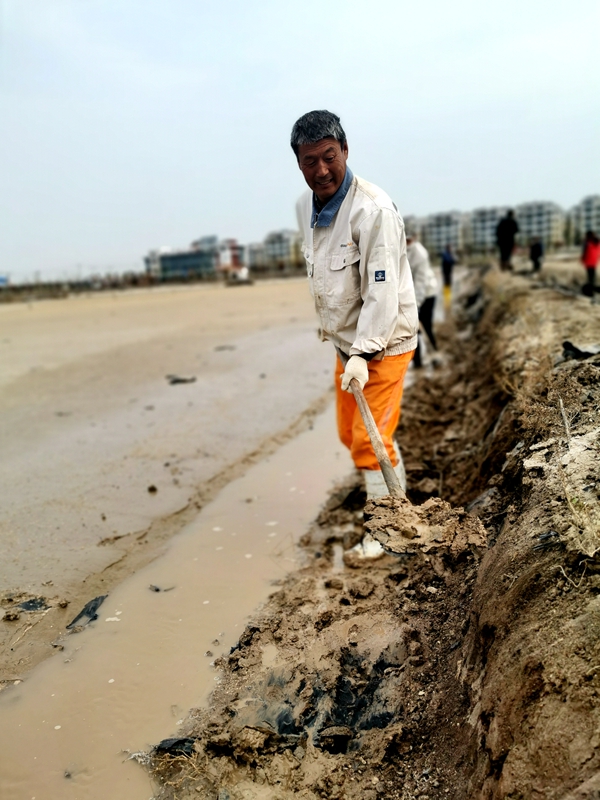 打虎親兄弟,上陣父子兵。海州灣公司得知兄弟單位求助后,18個生產單元職工連帶3名生產班組長全家總動員,手拿鐵掀,腳登水靴,齊齊上陣。