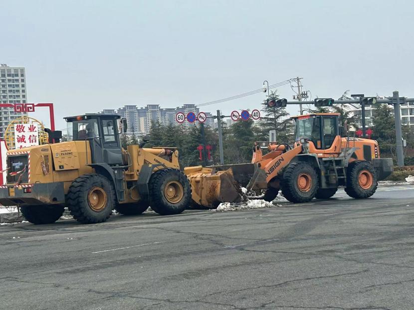 ? ? 一方有難,八方支援。由于本次降雪量大、勢(shì)急、持久,單靠環(huán)衛(wèi)分公司無(wú)法全面完成任務(wù),在上級(jí)領(lǐng)導(dǎo)的統(tǒng)籌考慮下,兄弟單位火速馳援,大綠化、大市政、大采購(gòu),大的不僅是業(yè)務(wù)整合,更是人心凝聚,更是集思廣益。翔立、盛達(dá)利用鈣液和工程資源優(yōu)勢(shì),通過(guò)架設(shè)大型原料桶儲(chǔ)備鈣液水,由3-5輛工具車(chē)進(jìn)行24小時(shí)鈣液拋灑,積冰融化速度超出預(yù)期,提升了后期鏟車(chē)的工作效率,順利保證了上下班高峰期交通順暢。特別是在2月22日,在兄弟單位的協(xié)助下在清晨8點(diǎn)完成了活動(dòng)路線保障及市領(lǐng)導(dǎo)掃雪除冰視察。
