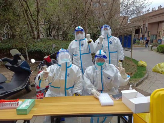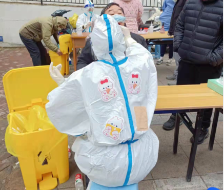 ? ? 12日? 7點集合,領(lǐng)裝備,鑒于昨天的教訓(xùn),早上沒喝水,吃了兩口飯,要不大白服就浪費了。出了點意外,排小區(qū)把我們小區(qū)給忘了,沒醫(yī)生來支援,就三個醫(yī)生,三個點,三張臺,隊伍排的那叫一個長?!罢埓蠹野呀】荡a打開,保持一米距離,戴好口罩!”這是我上午說的最多的幾句話。咱們贛榆的醫(yī)生非常辛苦,累了一上午,下午還要采黃碼,掃樓,向他們致敬!中午剛領(lǐng)盒飯就通知徐州支援的醫(yī)生到了,來了十幾個,扒拉兩口飯,開始穿裝備。第七輪結(jié)束,感覺人都廢了,渾身濕透,嗓子疼,不想動!