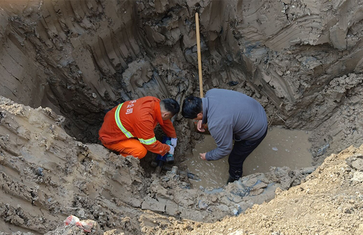 11時,已查明管道漏點處系PE63管道斷裂,至于管道斷裂的原因,判斷是地面沉降使管道落差錯位所致。搶修人員站在2米多深的泥坑里,不怕臟和累,徒手加緊管道搶修。經(jīng)2個多小時緊張有序搶修,成功將斷裂的水管修好。于當日下午16時30分恢復供水,有力保證了轄區(qū)春季綠化澆灌工作正常開展。(王宜全、楊維軍)