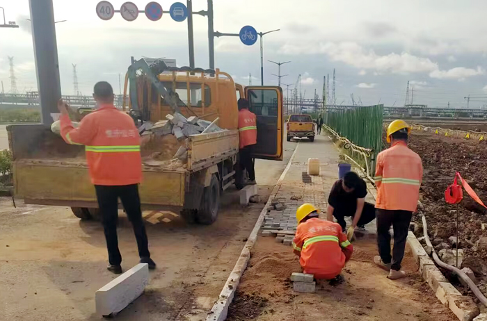 走進新區(qū)石化十路一處施工現(xiàn)場,“市政尖兵們”正井然有序地對因施工車輛碾壓造成人行步道地磚破損處進行修復。人工拆除原受損人行道地磚,對缺失路牙石進行補缺并壓實整平基礎、定位放線、更換面包磚和盲道磚,經(jīng)過2個多小時緊張施工,原坑坑洼洼的路面,取而代之是敞亮平整。多日來,默默無聞的市政“尖兵”們用勤勞的雙手加速施工進程,用實干詮釋徐圩悅升市政人的新風采。目前,已完成徐圩大道、云河路等10條主次干道兩側(cè)人行道集中巡檢修補工作,共整治32處,更換面包磚約96平方米、路緣石33米、盲道地磚11平方米。