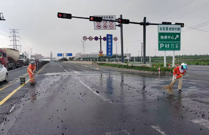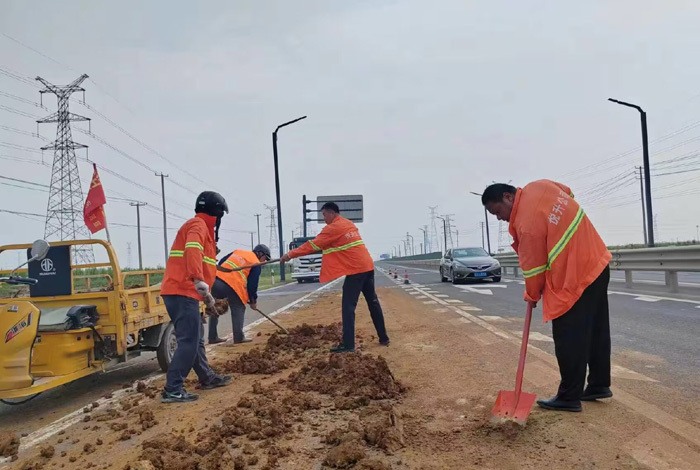 7月27日上午,臨近下班之時(shí),該分公司228省道班長(zhǎng)姚功,接到公司應(yīng)急處理電話,疏港大道向西路面近1500多米長(zhǎng),車輛拋灑嚴(yán)重影響往來車輛安全經(jīng)過。正在下班的途中他二話沒說,調(diào)轉(zhuǎn)車頭奔赴事發(fā)地點(diǎn)疏港大道,迅速擺開安全錐,揮動(dòng)手中鐵銑開始突擊清理路面上礦土,石塊。聞?dòng)嵉弥耸?,共產(chǎn)黨員紀(jì)樹好,胡可貴,班組成員孫洪召等同志二話沒說,一并趕往現(xiàn)場(chǎng)支援,橙色工作服在陽光照耀下顯得格外靚麗。工作現(xiàn)場(chǎng),遇到大的石塊他們就用手搬,小的、碎的就用鐵锨和掃把清理,中午的陽光火辣辣的,他們就這樣頂著烈日奮戰(zhàn)近兩個(gè)多小時(shí),共轉(zhuǎn)運(yùn)礦土泥塊、石子近10余車,高質(zhì)高效保障了核心道路車輛安全通行。(楊波)